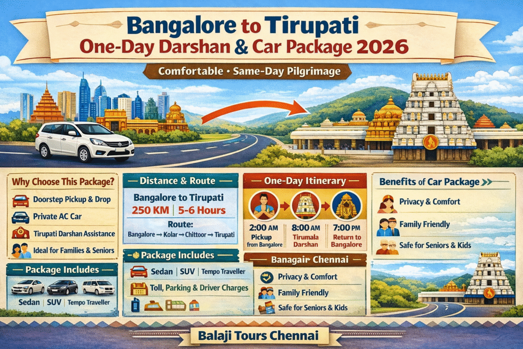 Without advance planning, this trip can go wrong fast. That is why most families choose a Tirupati one-day car package from Bangalore with a trusted operator like Balaji Tours Chennai.