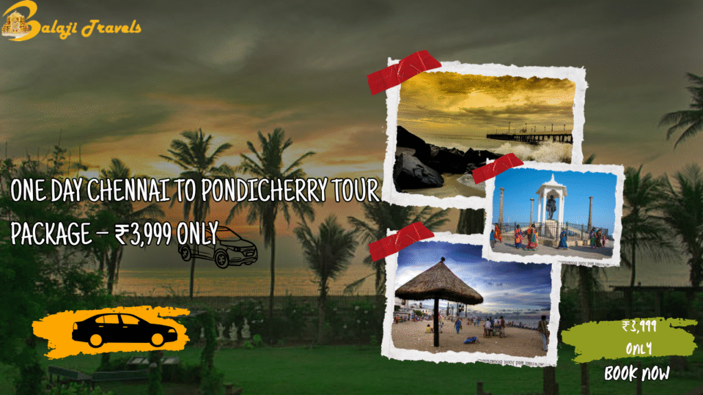 Plan your one-day Chennai to Pondicherry tour by car from ₹3,999 with Balaji Tours Chennai. AC cars & expert drivers included.