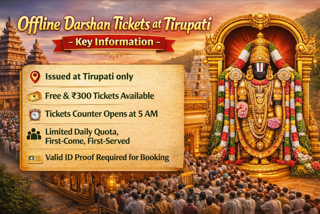 TTD issues a limited number of offline darshan tickets daily at the Central Reception Office (CRO), Tirupati. Availability depends on the temple schedule and TTD quota, which can change without notice.