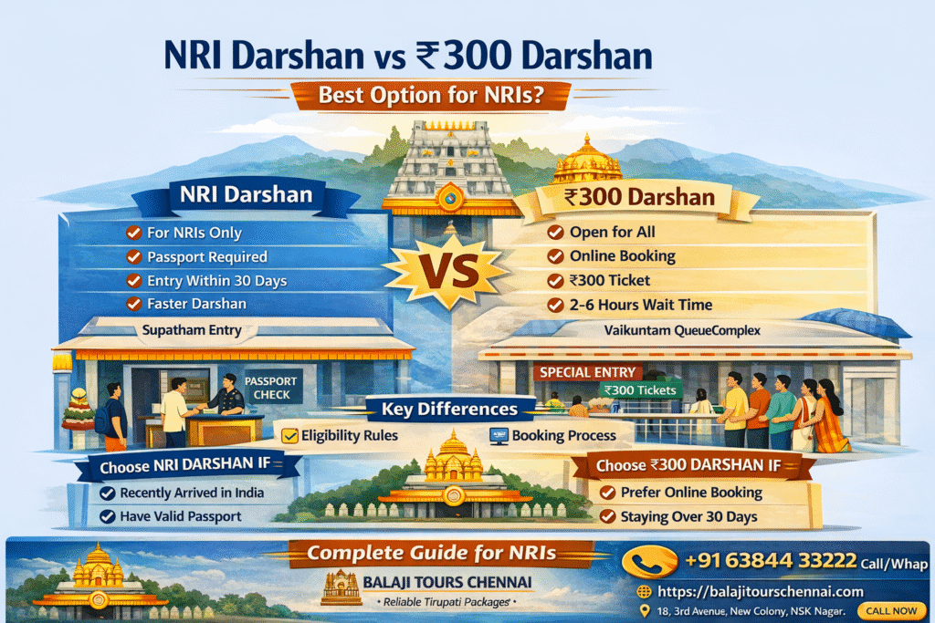 This detailed comparison of NRI Darshan vs 300 Darshan will help you understand the differences, costs, benefits, and the best Tirupati Darshan option for NRIs in 2026. If you are booking through Balaji Tours Chennai, this guide will also help you make the right choice.