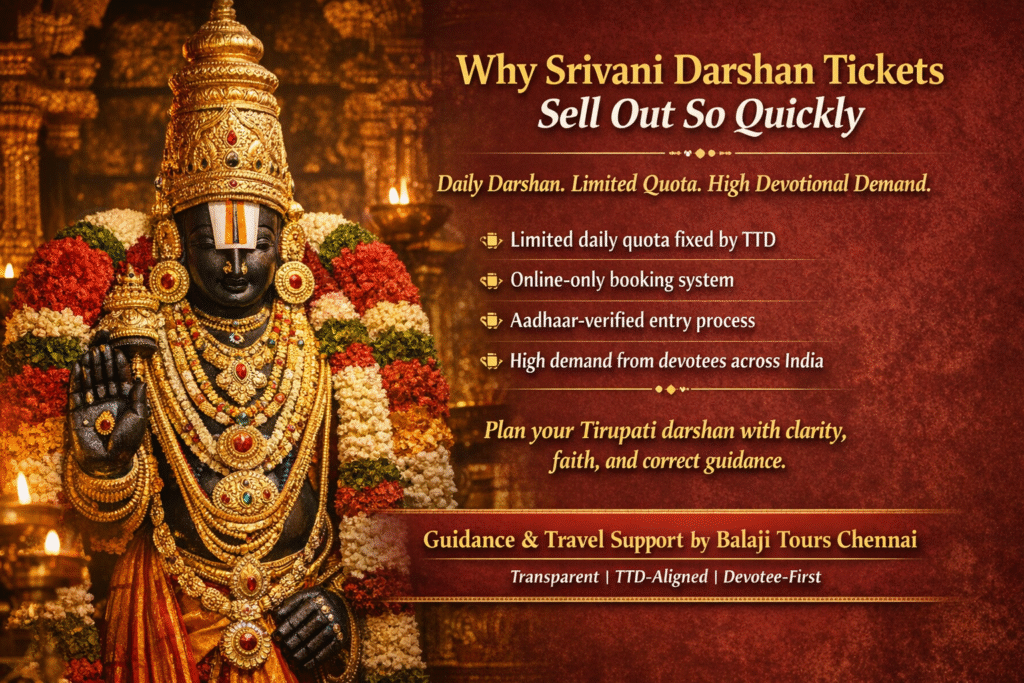 Many devotees feel worried and confused when they see Srivani VIP Break Darshan – Sold Out”, even though Srivani Darshan is happening every day at Tirumala Tirupati Balaji Temple. This mismatch often leads to panic, last-minute Tirupati travel plan changes, and fear of missing Lord Venkateswara Swamy’s divine darshan. The truth is, Srivani VIP Break Darshan tickets are not stopped—they are conducted daily under a very limited, tightly controlled quota set by Tirumala Tirupati Devasthanams (TTD). With clear guidance from Balaji Tours Chennai, understanding how the TTD Srivani Darshan booking system truly works can remove stress, prevent misinformation, and help devotees plan their Tirupati darshan booking with confidence and clarity.