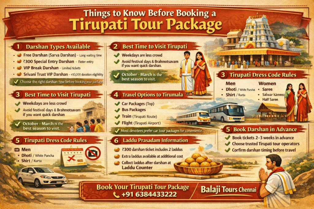 Planning a Tirupati tour package can be exciting, but without proper preparation, it may lead to stress, long waits, or unexpected costs. Whether you’re traveling from Chennai or nearby cities, knowing the right things before booking ensures a smooth and spiritually fulfilling Tirupati pilgrimage. Here’s a complete guide to help you plan your visit with ease, especially when booking with a trusted operator like Balaji Tours Chennai.