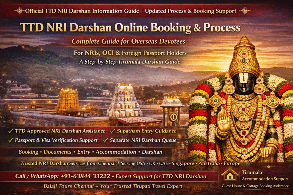 This complete guide explains everything NRIs need to know about Tirupati NRI Darshan, including the TTD NRI darshan process, online booking steps, eligibility, required documents, accommodation options, entry routes, and professional support provided by Balaji Tours Chennai.